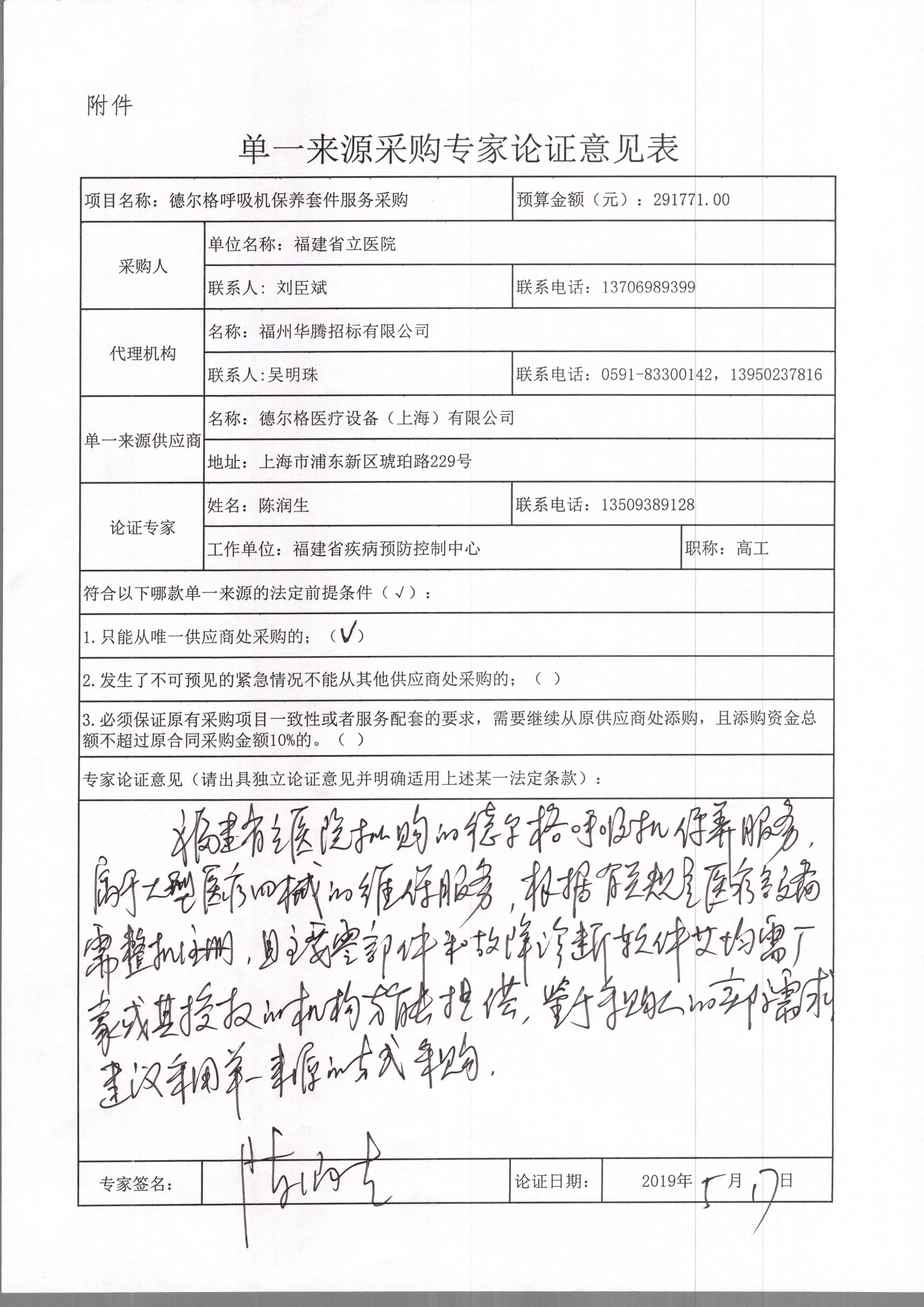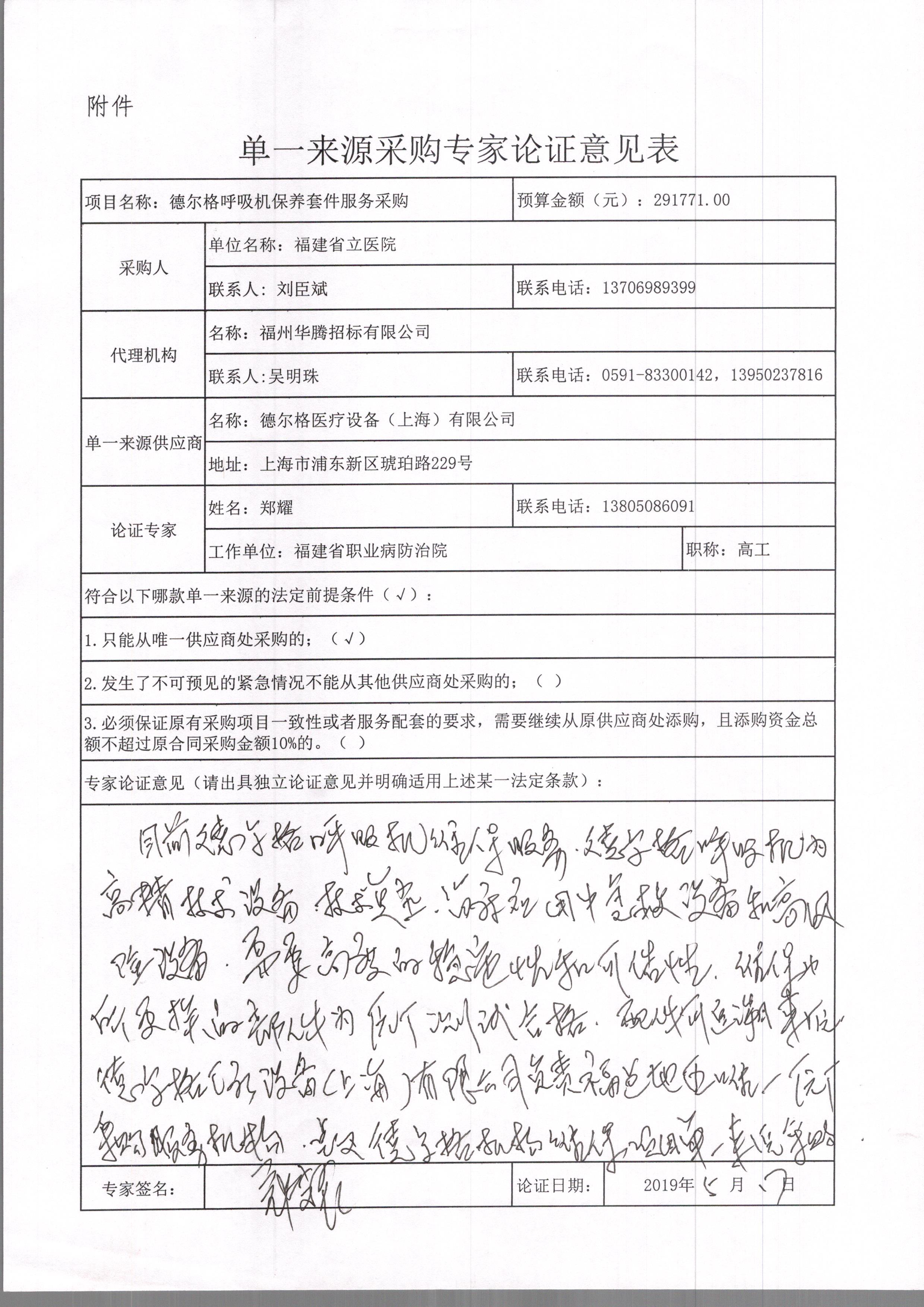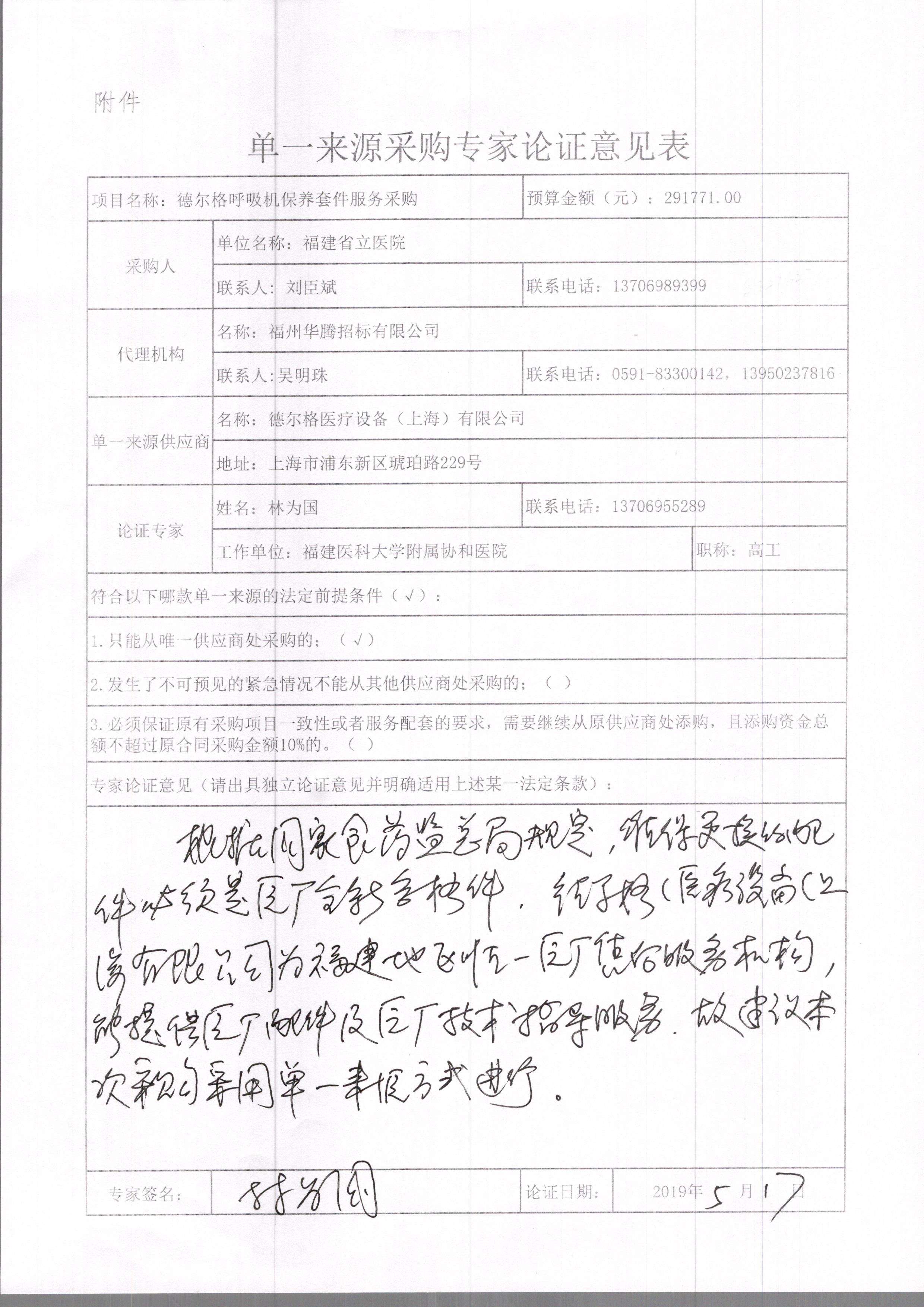 4、采用单一来源采购方式的原因及相关说明:我院是福建省卫健委直属规模最大的三级甲等综合医院,集医疗、教学、科研于一体,专业技术人才高度密集,2018年门急诊人数近200万人次,出院人数近9万人次,为保证医疗服务品质,我院配备有一批先进医疗设备,目前德尔格呼吸机维保服务项目亟待采购,由于德尔格呼吸机为高精技术设备,技术复杂,且属于临床使用中的急救设备和高风险设备,需要高度的稳定性和可靠性,根据国家食品药品监督管理总局18号令等法规,维保中所更换的部件必须为原厂全新测试合格件,进口备件必须提供相应的《报关单》,配件可追溯来源。德尔格医疗设备(上海)有限公司原厂家专业提供本设备的维修技术及相关的备件。德尔格医疗设备(上海)有限公司为德尔格公司负责福建地区唯一原厂售后服务机构,负责上述类型设备的维保服务。