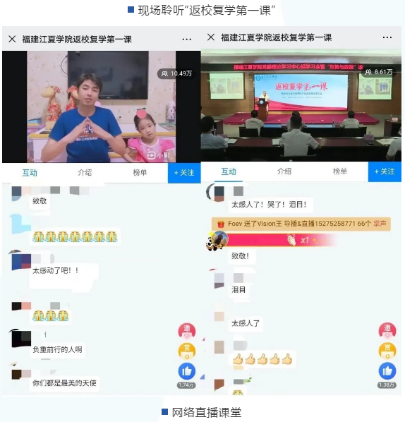 报告会持续了两个多小时,福建江夏学院会场内掌声不断,网络直播间的留言区时时刷屏,“泪目、看哭了、致敬、太感动了、你们是最美的天使、英雄就在我们身边”师生及网友们热情的留言深深表达了他们的激动之情。大家纷纷表示,要以抗疫英雄为榜样,把抗疫精神转化为推动专业学习和实际工作的强大动力,勇担当、善作为,在学习生活和本职岗位上实现新作为、取得新业绩。