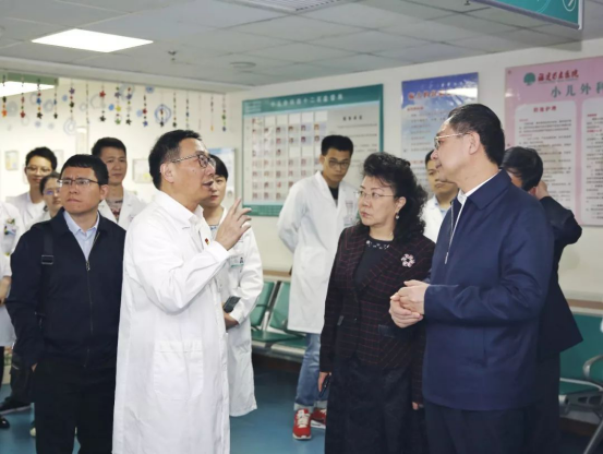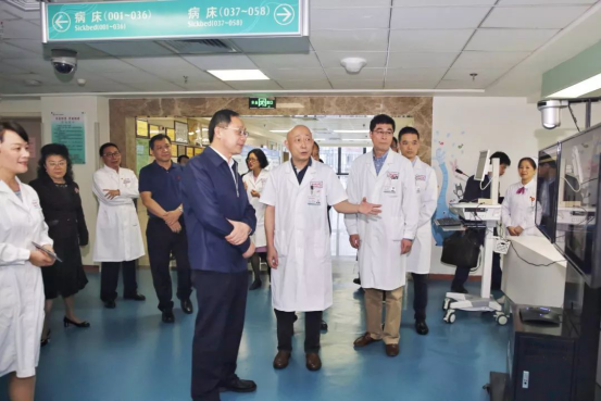 于学军副主任一行深入我院门诊、儿外科病房、院史馆等,听取“互联网+医疗健康”工作进展情况汇报,了解互联网医院建设、语音电子病历、按病种收付费、床旁结算等医疗信息化应用情况;现场体验三码融合、刷脸支付等便民服务;观摩360环球在线登录互联网医院远程协同门诊、远程床边联合查房等。