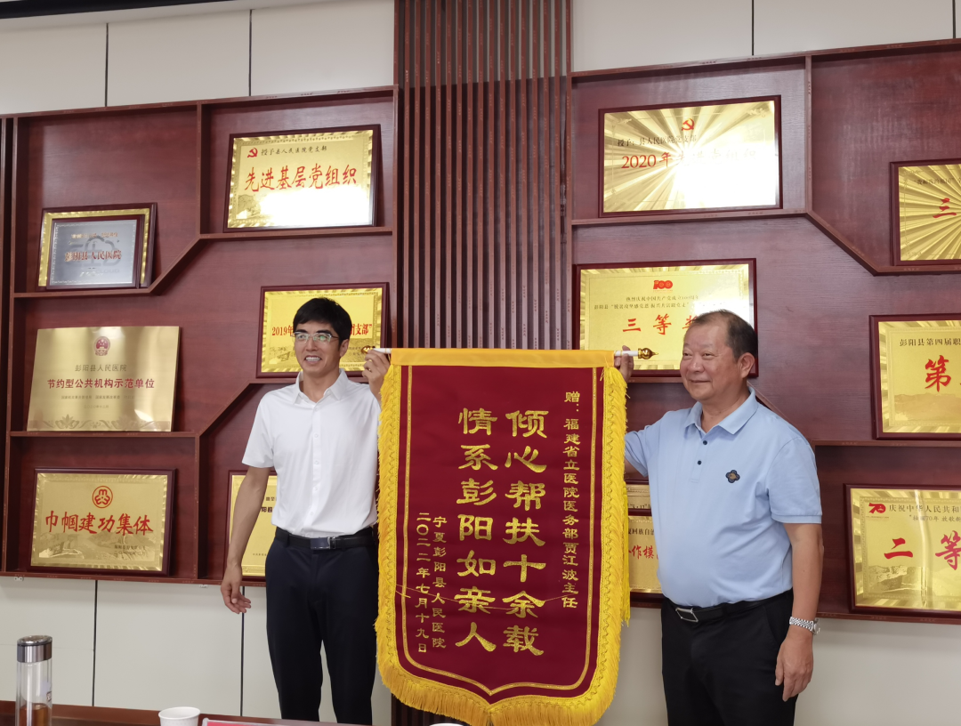 ▲彭阳县人民医院向我院首批援宁干部贾江波赠送锦旗,对其十多年来的倾心帮扶致以敬意