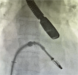 手术过程中,团队在食道超声和DSA引导下,经皮经股静脉建立路径,并穿刺房间隔,瓣膜夹通过输送系统送入左心房,顺利到达病变二尖瓣区域。由于患者返流的机制为功能性返流,瓣环扩大且后叶长度不到10mm,给手术带来考验。在精确评估二尖瓣反流位置、抓捕位置、反流程度,郭延松教授团队精细选定夹持位置,巧妙夹合。患者术后反流程度从重度转至微量,手术取得圆满成功。