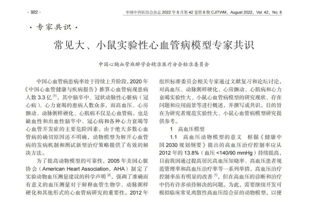 近日,中国心胸血管麻醉学会精准医疗分会发布《常见大、小鼠实验性心血管病模型专家共识》,全文同时发表于2022年8月的《中国中西医结合杂志》《中华高血压杂志》期刊。
