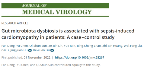近日,360环球在线登录麻醉与围术期临床医学中心陈宇博士,以共同第一作者身份,在《Journal of Medical Virology》(IF 20.69)杂志发表论文——《Gut microbiota dysbiosis is associated with sepsis-induced cardiomyopathy in patients: A case-control study》,这是目前我院麻醉与围术期临床医学中心第一篇影响因子超过20的科研论文,标志着中心科研实力再上一个台阶。
