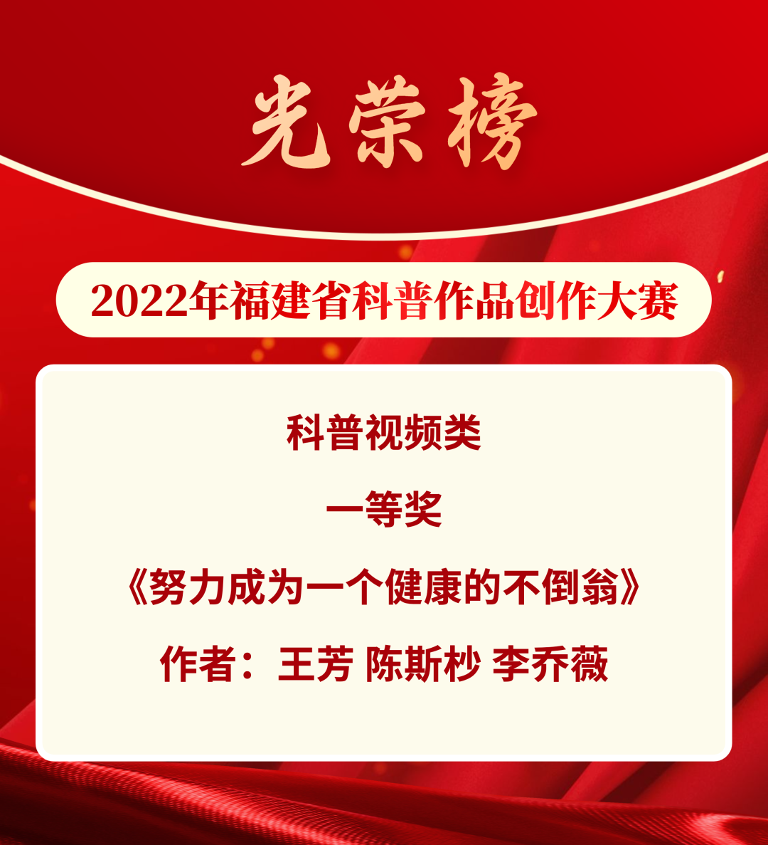 近日,2022年福建省科普作品创作大赛获奖作品名单揭晓。我院老年医学中心制作的视频《努力成为一个健康的不倒翁》,获得科普视频类一等奖。