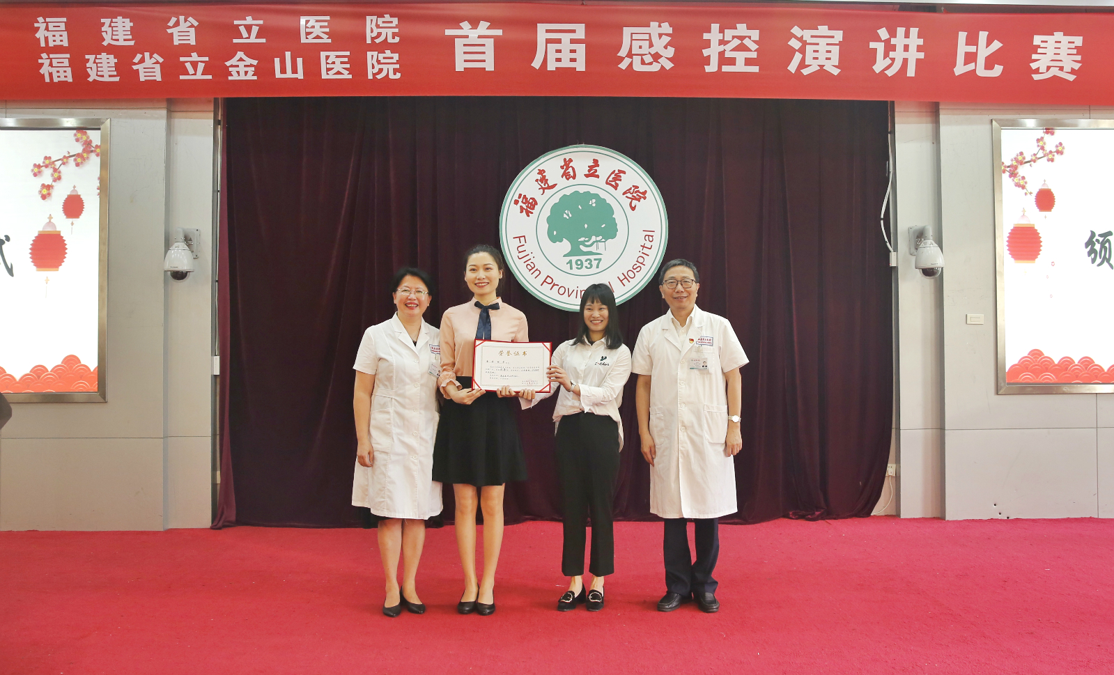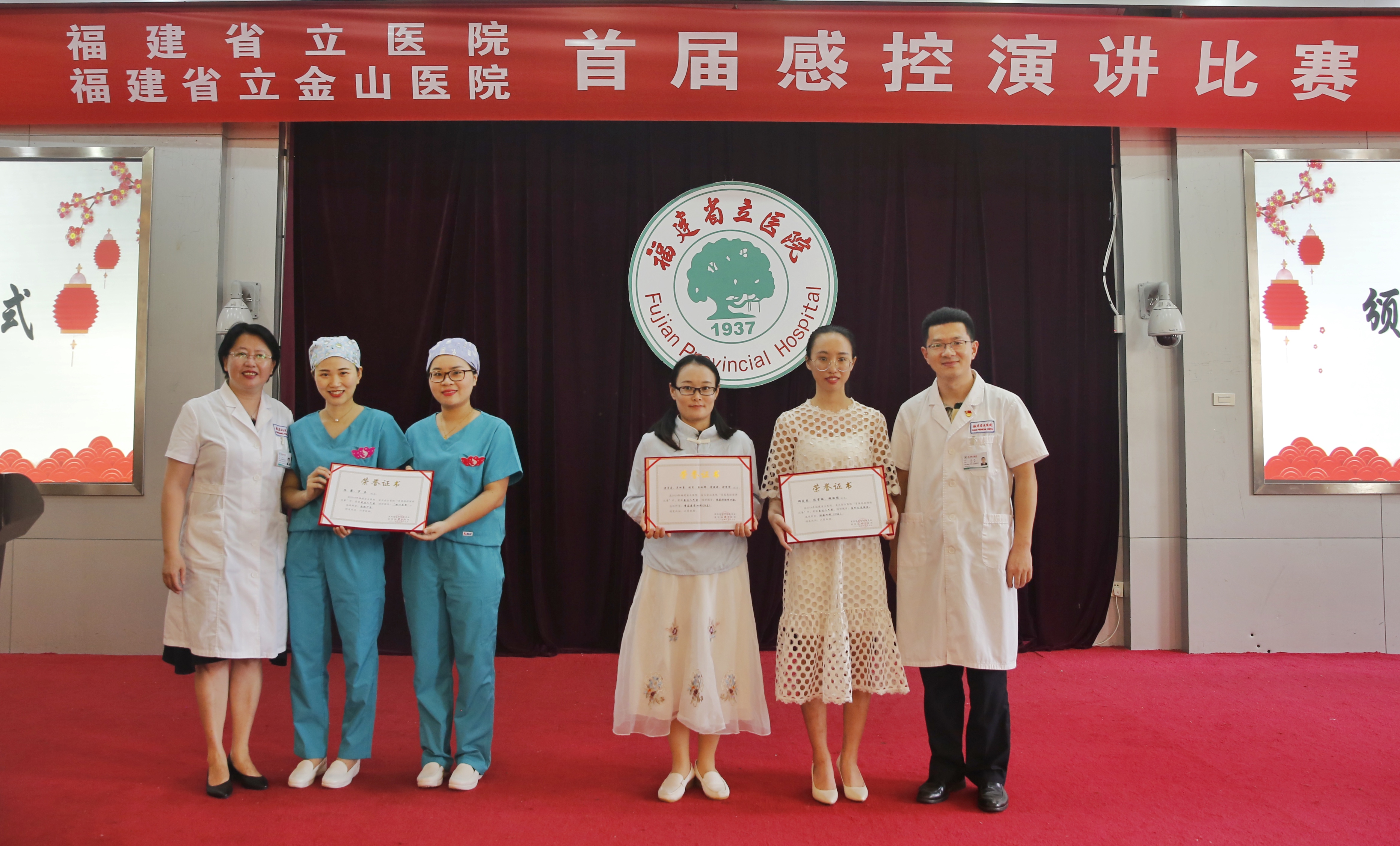 ▲重症医学五科王娟、黄记裕、孙景虎、刘勇乐、李小青《罩样精彩》;南院妇产科胡绪洋、阮舆鑫、郑小丹《感控伴我行》获得一等奖
