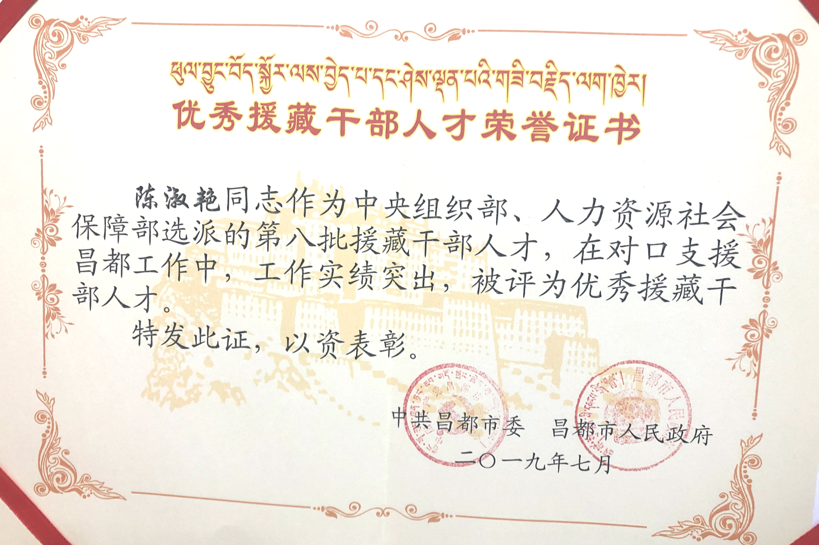 在援藏的一年半时间里,陈淑艳积极参与昌都市妇幼保健院新院区的筹建工作,跋涉3000多公里对昌都各区县300余名医护人员进行系统、规范化的培训,传播袋鼠式护理方式,提升基层医务人员的新生儿复苏理论和技能操作水平,有效解决昌都市偏远地区高危新生儿因长途转运至市区治疗引发的低体温问题。一年多来,她始终坚守着“团结奉献,真情融入,不畏艰难,不辱使命”的援藏承诺,克服了高原反应和文化差异带来的困难以及对亲友的思念,全身心投入援藏工作,先后荣获2018年昌都市妇幼保健院优秀工作者、360环球在线登录第三届省立青年榜样、2019年福建省第八批援藏工作队优秀援藏队员等荣誉称号。