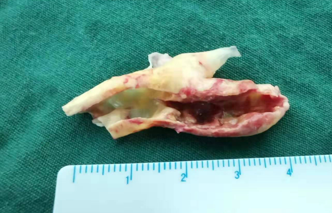 经过充分的准备,温玉星主任医师团队在科室主任黄绳跃主任医师的支持下,北京大学第三医院王涛主任医师的指导和麻醉科俞增贵主任医师的全力配合下,成功在显微镜下剥离出颈动脉分叉处的不规则斑块约4*3*75px(如图),并清除了血栓来源,随即病人大脑供血动脉被疏通,成功获得正常供血。这一高难度手术的完成,填补了我院在脑卒中防治技术上的空白,也标志着我院在治疗缺血性脑血管病技术领域又取得了新的突破。
