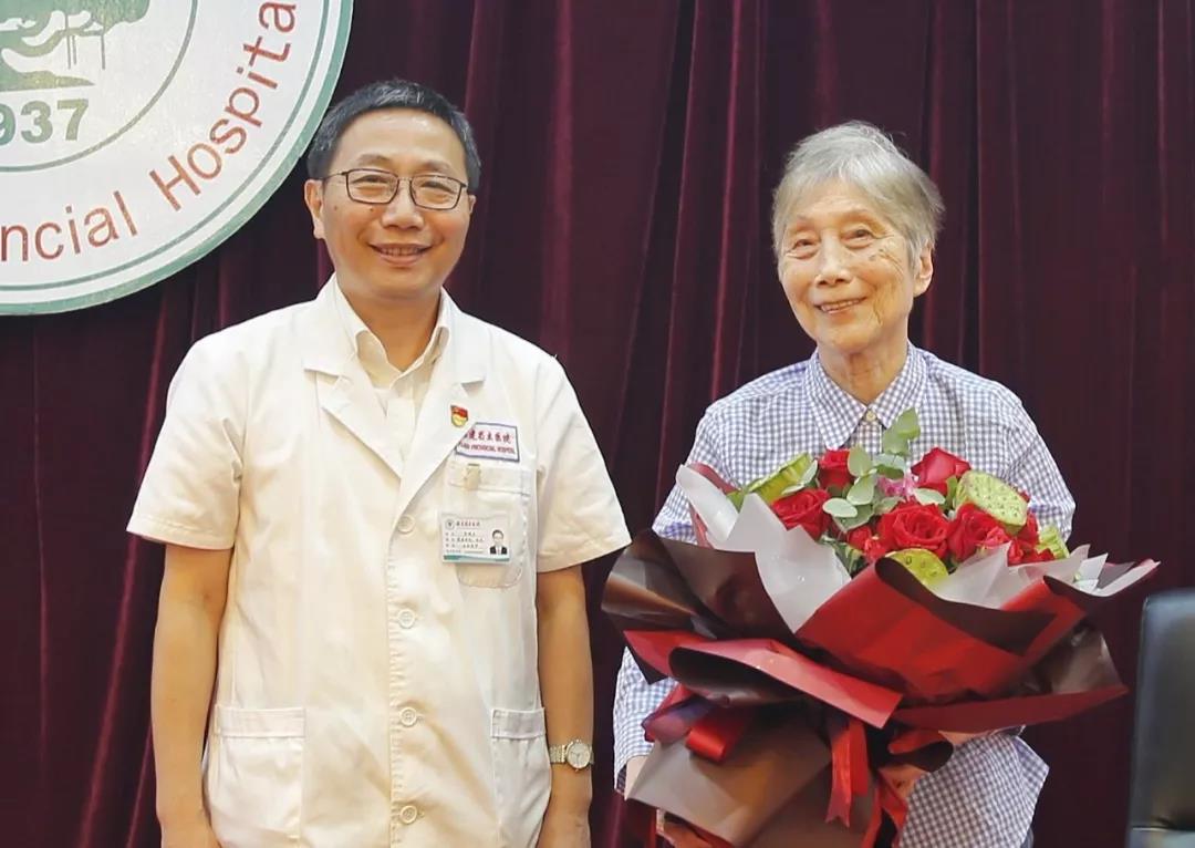 在致敬医学前辈环节,朱鹏立院长代表全院员工向潘秀珍教授献花,表达崇高的敬意。随后,潘秀珍教授满怀真情实感,与大家分享了从医执教70周年感言,并寄语年轻医生,要多一份奉献,多一份爱心,把学到的医学知识毫无保留地奉献给医疗卫生事业,给病人献上一份真挚的友情,真正履行救死扶伤、治病救人的神圣职责,让精于医术、诚于医德永远闪光。她还呼吁社会各界人士,对医护人员、对医疗卫生事业要多一份理解,多一份支持,和谐医患关系。