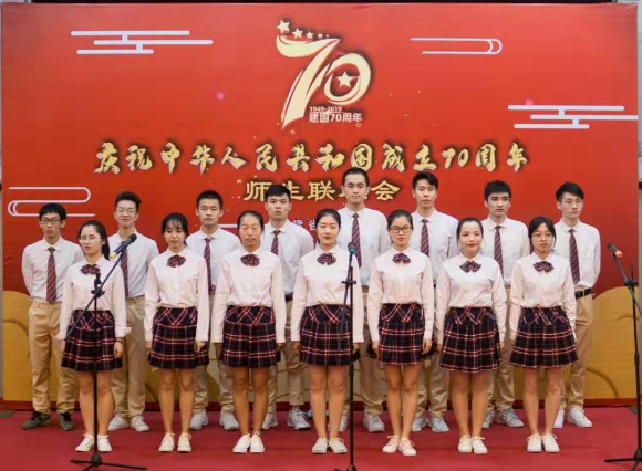 最后的师生合唱《我和我的祖国》将联欢会的气氛推到高潮,鲜艳的五星红旗飘扬在会场的每个角落,汇聚成红色的海洋。那深情的歌声饱含着对祖国的热爱与祝福,也传达着对人民健康的美好祝愿。