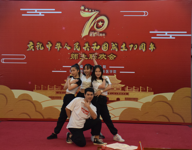 联欢会在麻醉专业同学们活力四射的街舞中拉开序幕。内科教研室的教师们带来的《我喜欢》展示了他们面对繁重的临床工作仍不忘对教学的热爱,让人敬佩而感动;护理专业的舞蹈《手心相护》别具一格,将七步洗手法编排成活力轻松的舞蹈,让在场观众在欢乐中还能温习院感知识;超声科老师和住培基地学生的哑剧《输液厅插曲》“包袱”不断,让“卓别林”式的幽默与智慧、跃然而出;诗歌朗诵《祖国啊,我亲爱的祖国》则展现了学生们对祖国的忠诚与热爱。