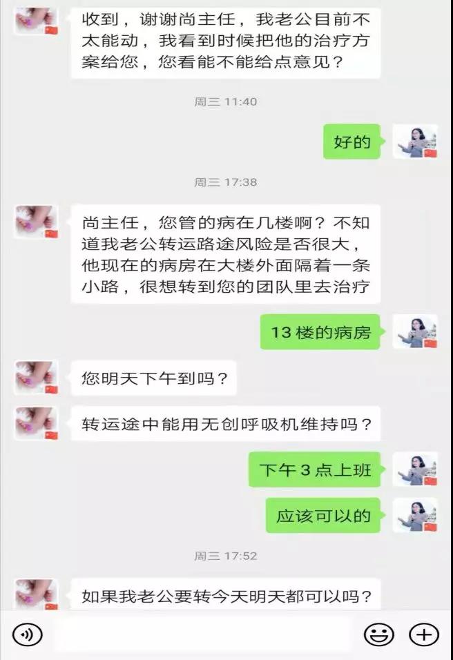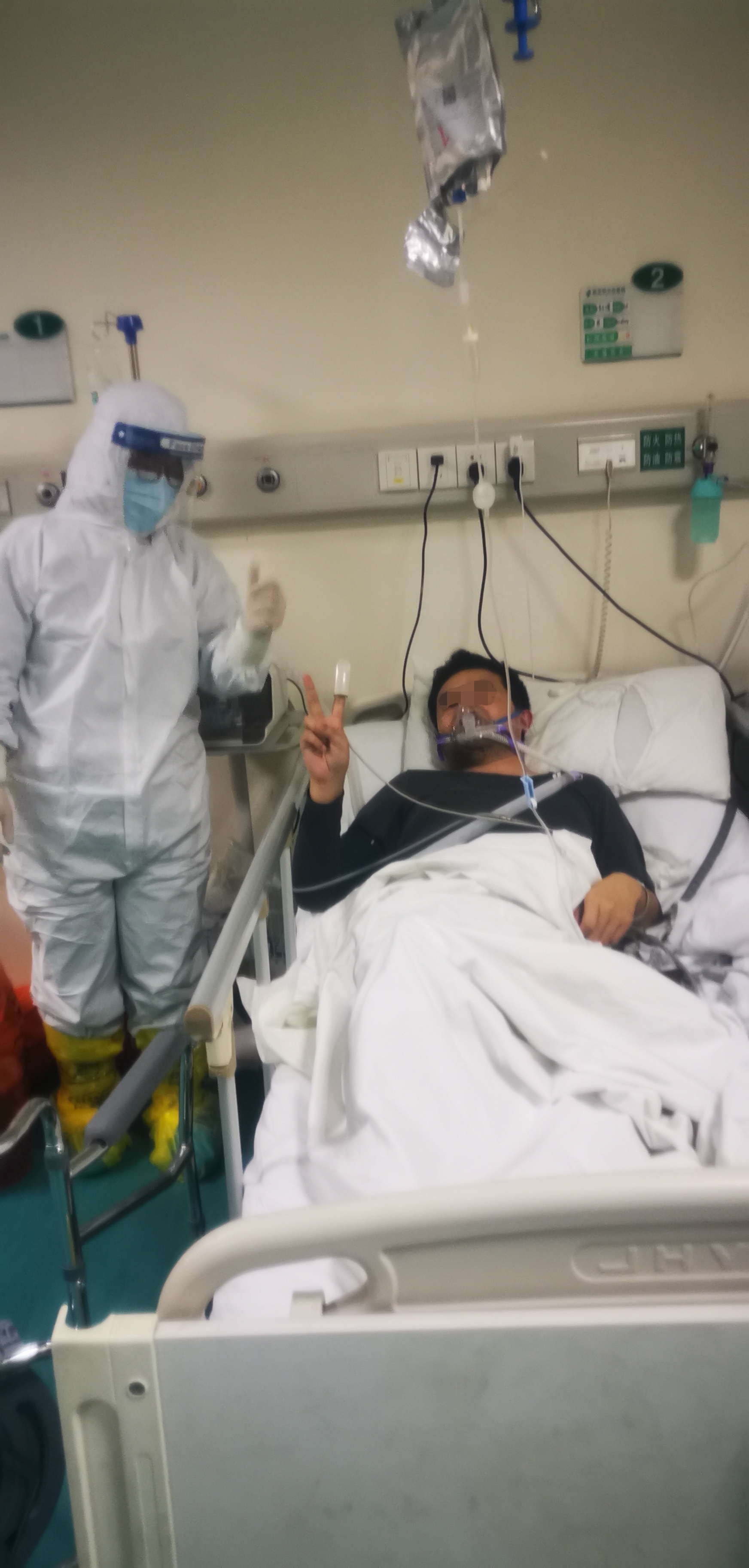 我和队友全副武装,进入病房,在前一班队友和当地老师的帮助下,我们很快熟悉了病历和医嘱操作系统。此时,一位87岁高龄的病毒性肺炎病人收入病区,作为医疗组组长,我给团队简单进行了分工,大家分头开医嘱、跟家属签字谈话、写病例等。安顿好这位老人后,我赶去另外一间病房,查看一位新冠肺炎病人,这是一位感染较重的重症病人,正在接受高流量吸氧治疗(流量50L/min,吸入氧浓度80%)。我靠近病人,跟他进行了简短的沟通,给予心理疏导和安慰,嘱咐他保持有效的体位,以改善肺通气血流比,进行体位肺复张,病人在侧身的时候末梢血氧饱和度上升,随后我又根据生命体征调整了给氧装置的参数设置。经过一系列对症处理,病人感觉舒服了很多,向我竖起了大拇指。