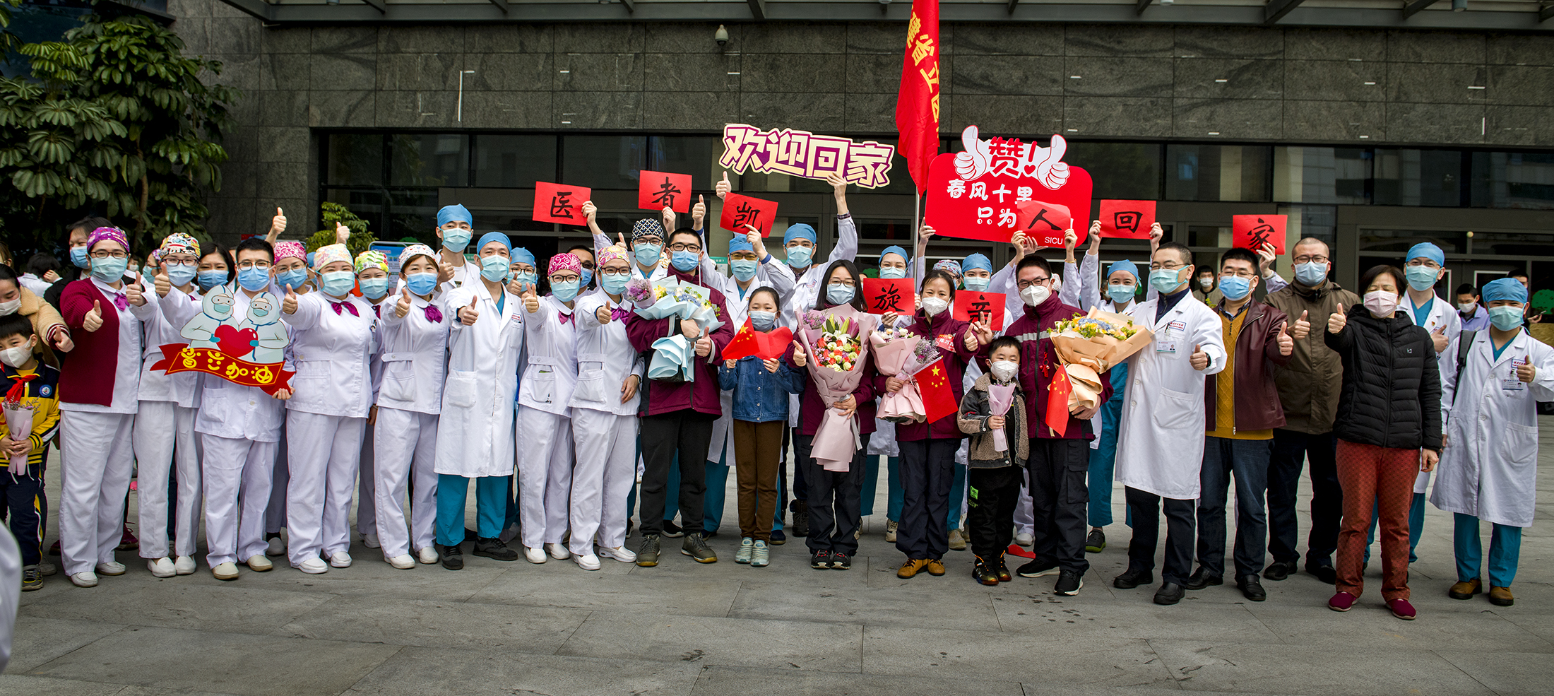 医院喷泉广场上回荡着温暖的歌曲《你安好,我无恙》,大屏幕上英雄们摘下口罩最美的样子令同事们眼前浮现出征时那一个个义无反顾的背影。