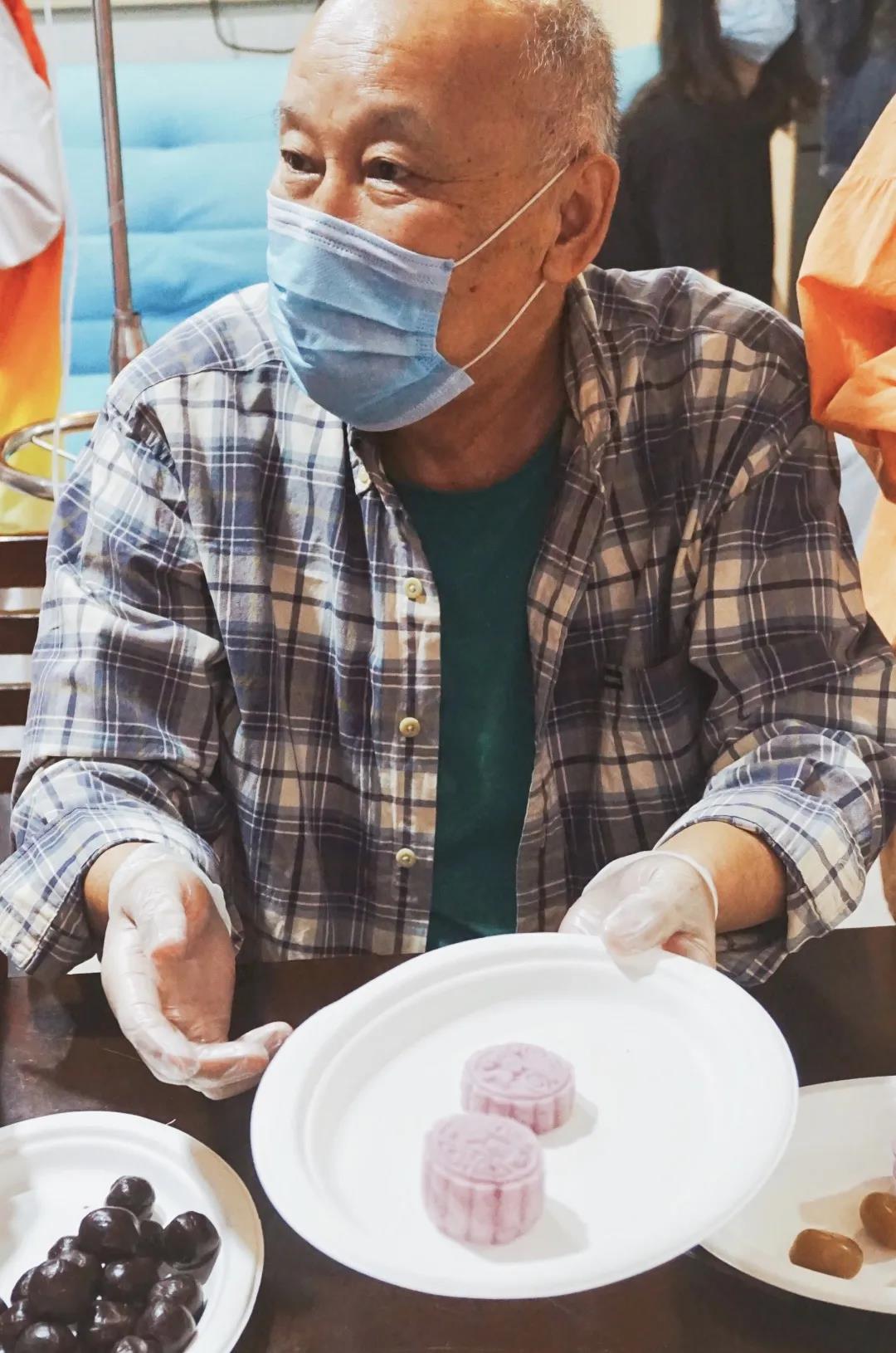 病房里的“C位大叔”向大家展示自己制作的月饼,活动室内一片其乐融融。
