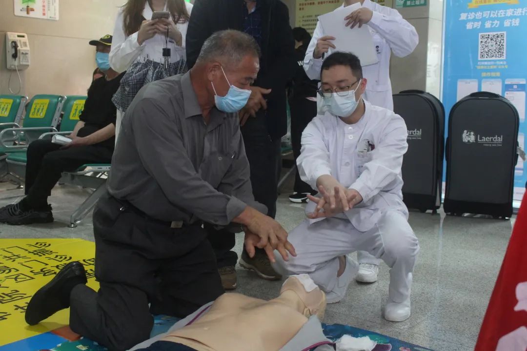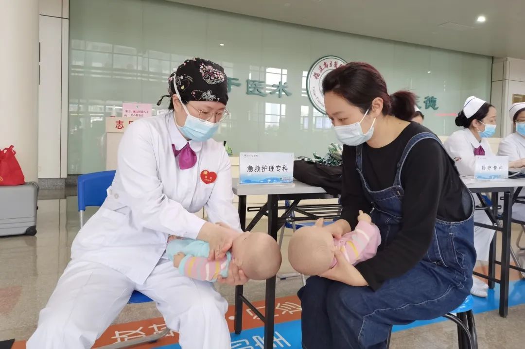 急诊护理专科护士设置了急救技能培训区,现场为居民传授急救知识,并手把手教授心肺复苏术、气道异物梗阻急救法等急救技能,吸引不少群众驻足学习。