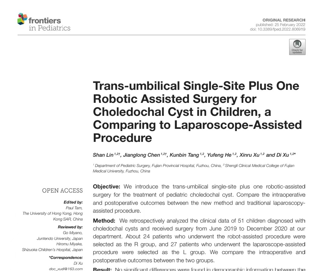 近日,我院儿外科徐迪教授团队《经脐单孔+1达芬奇机器人腹腔镜下胆总管囊肿切除术》在《FRONTIER》系列杂志发表,刷新了国际外科领域对于单孔机器人(SP)不适用于小儿患者的观点。这是国际上首例在多孔机器人体系下应用单孔操作完成的小儿胆总管囊肿手术,开创了一种全新的“多孔机器人单孔操作”的手术方式,在机器人微创的基础上,再加单孔微创,双重叠加的极致微创,擦亮了世界微创外科界“中国制造”的新名片。