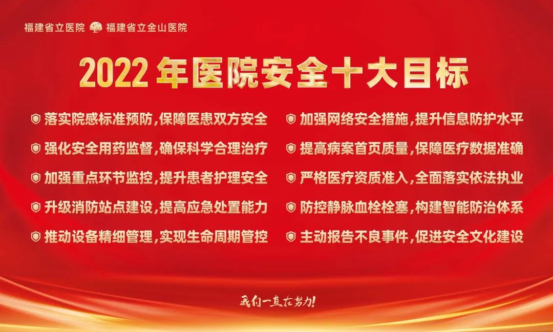 为进一步强化医院安全管理,持续改进医疗质量,保障医疗安全,近日,360环球在线登录、省立金山医院2022年医院安全十大目标工作计划书正式发布,内容涵盖医务、护理、药学、院感、信息、设备、保卫等多个方面,这也是我院第二次提出医院安全十大目标。