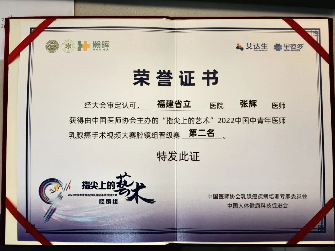 近日,第九届“指尖上的艺术”中国中青年医师乳腺癌手术视频大赛落下帷幕,我院肿瘤外科林孟波教授团队表现出色,再创佳绩,张辉副主任医师参赛并获得全国晋级赛第二名、总决赛第四名(腔镜组)的好成绩,为福建省唯一获奖选手,标志着我院乳腺腔镜手术水平位于全国前列。