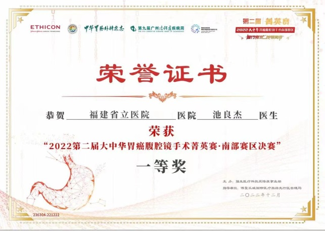 近日,全国第二届大中华胃癌腹腔镜手术菁英赛南区七省决赛举行,由我院薛芳沁副院长指导,池良杰副主任医师主刀完成的“完全腹腔镜下远端胃大部根治性切除术(D2)”,凭借先进的手术理念、精湛的手术技艺,获得全场专家评委的一致认可,荣获一等奖并晋级全国总决赛,这也是该团队连续两年蝉联该奖项。