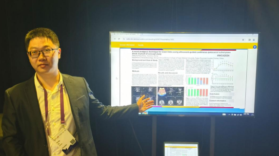 叶鹏主治医师汇报我院首创的超声引导骶旁筋膜间隙连续阻滞技术在临床中的应用研究。