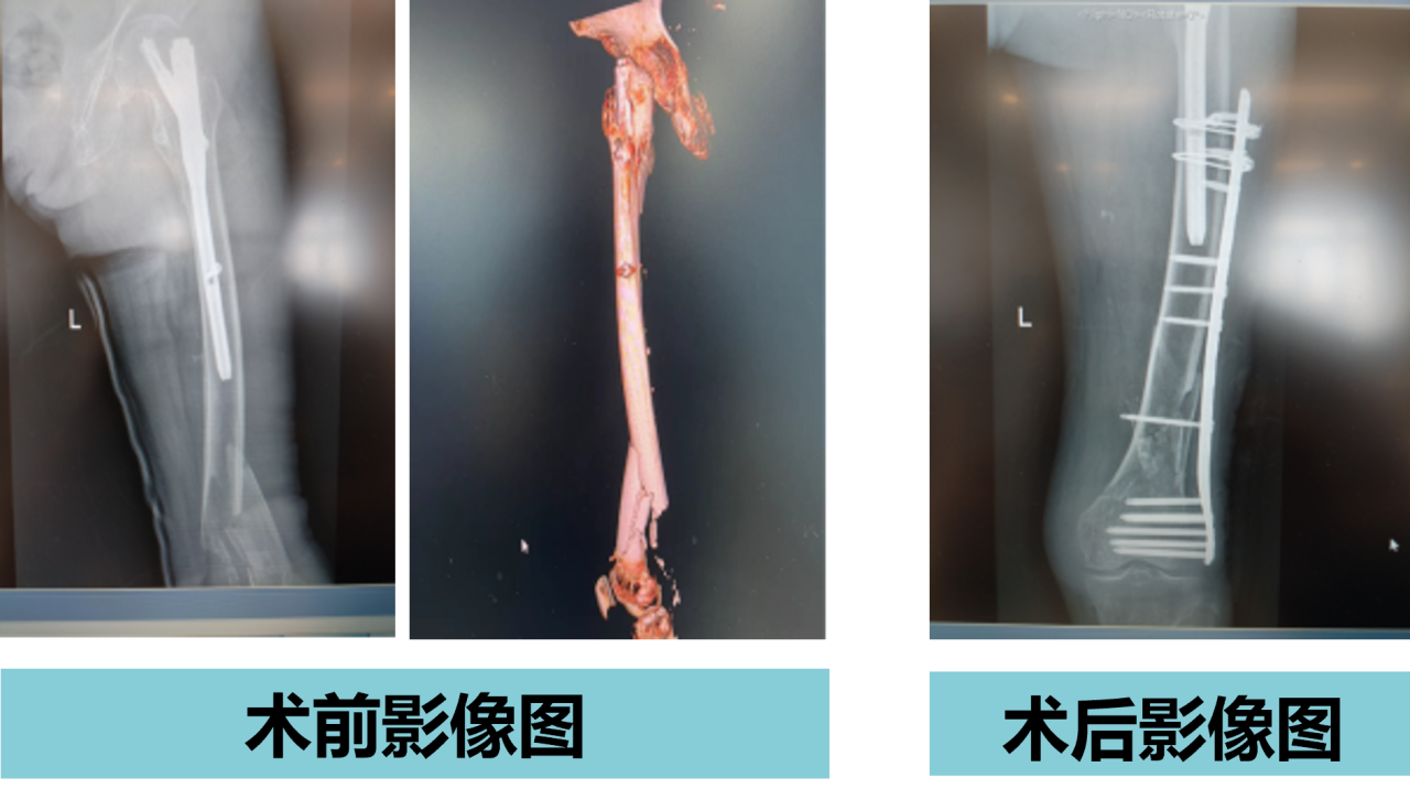 由于患者年龄高、手术风险大,同侧再发骨折,手术难度大,当地医院不敢为其进行手术,面对困难处境,家属再次慕名将患者送来我院骨科就诊。